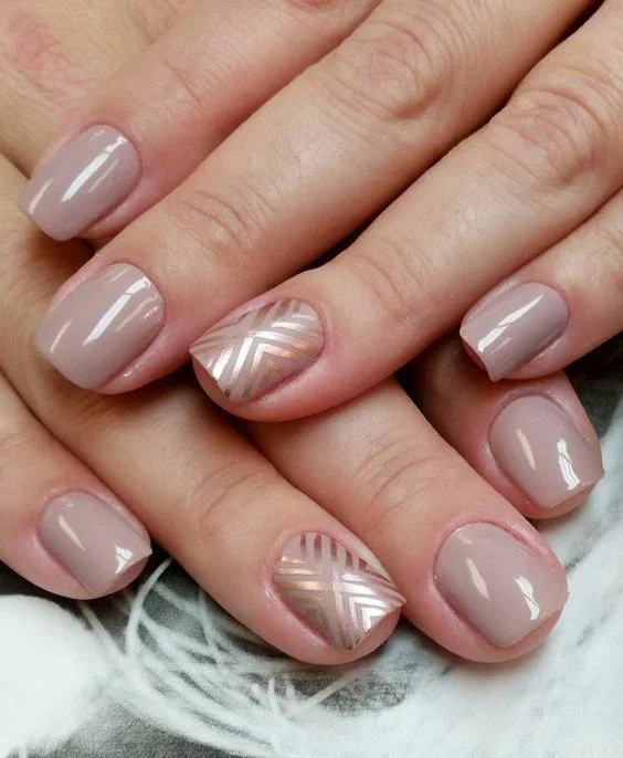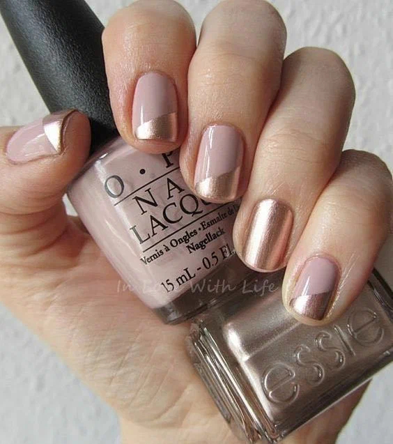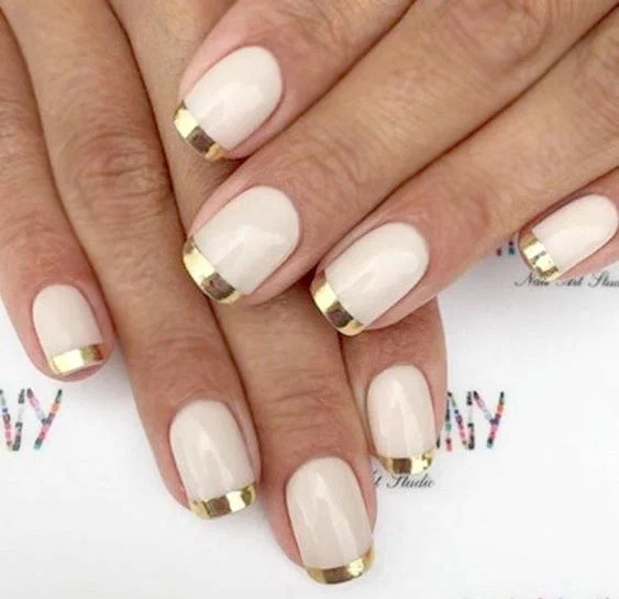 Зверніть увагу, як гарно у нейл майстрів виходить бежевий металік використовувати як промальовування сучасного дизайну. Шляхетний відтінок шампань з дрібним шиммером гармонійно виглядає на бежевому, молочному, а також білій базі. До речі, трендовий колір буде доречно використовувати для дизайну «французький манікюр».