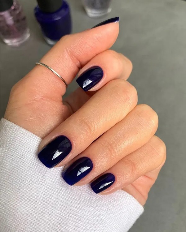Ще один трендовий колір манікюру цього сезону — насичений темно-синій. Він по-своєму унікальний, тому що зовсім по-різному виглядає залежно від світла. Він може бути максимально близький до чорного, а за інших обставин розкриється різними відтінками синього, наприклад, може відливати сапфіровим або індиго.