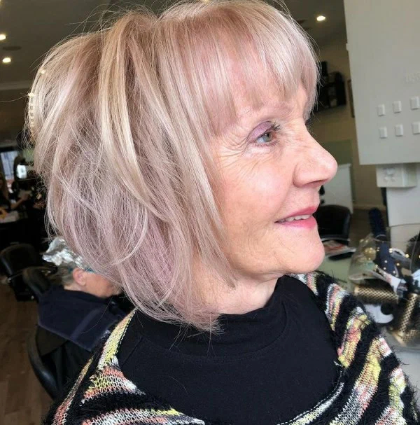 Полуничний блонд делікатно відростає на сивих жінках за рахунок мінімального розмаїття між основним кольором волосся і практично безбарвним корінням. А якщо виконати на пасмах невелику розтяжку до кінчиків, освітлюючи прикореневу зону, то можна взагалі не фарбуватися по 2-3 місяці.