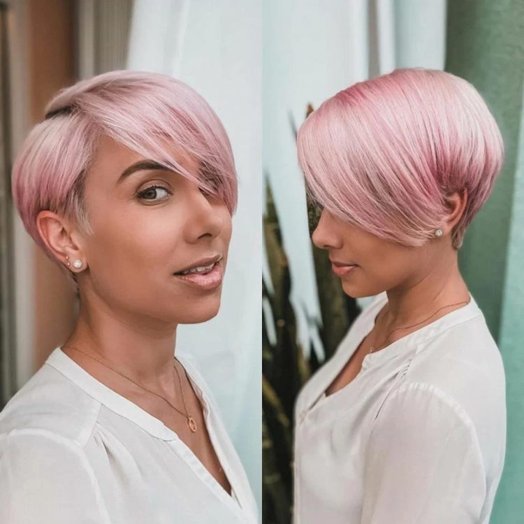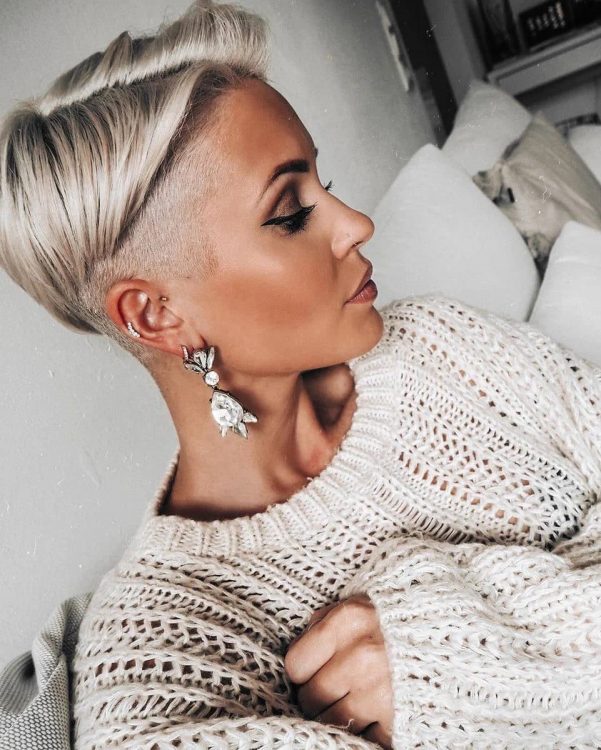 Ефектна коротка стрижка піксі з поголеними скронями та потилицею – чудовий варіант для жінок, які не люблять морочитися з щоденними укладаннями. Якщо ви цінуєте свій час, але не збираєтеся при цьому жертвувати своєю красою та привабливістю, вибирайте ультракоротку стрижку піксі з подовженою маківкою та косим чубчиком.