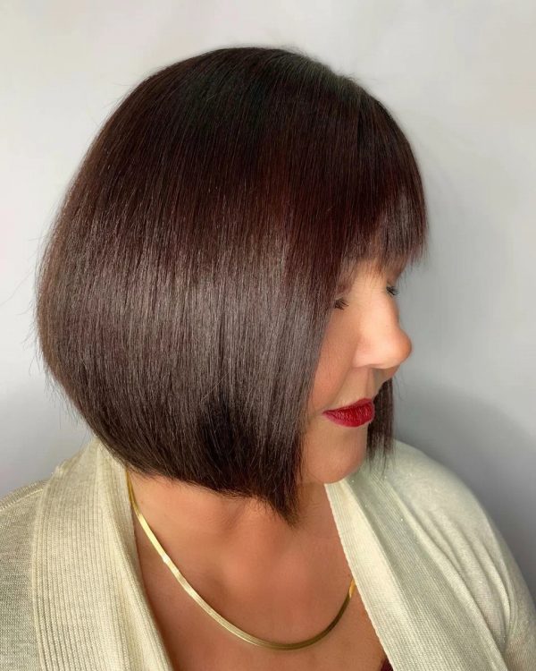 Старшим жінкам ідеально підійде стрижка боб з підкрученими кінчиками, а також прямий чубчик з градуюванням. Цей тандем чудово молодить і робить жіночу зовнішність привабливою.