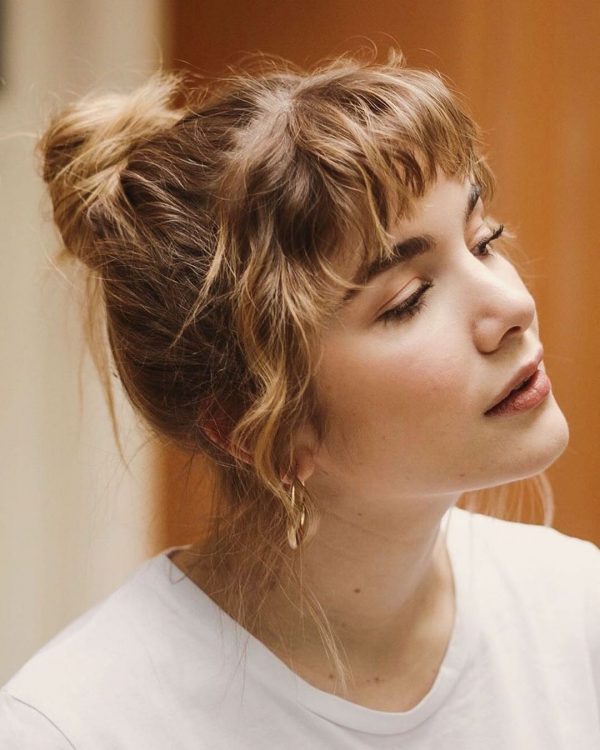Якщо немає часу «чаклувати» над локонами, завжди чудово виглядає розпущене волосся в стрижці каскад або лисячий хвіст. А модний чубчик лише посилить ефект краси.