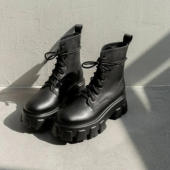 У таких черевиках вам не страшні ні кучугури, ні глибокі калюжі. Шкіряні черевики на тракторній високій підошві зі шнурівкою – безпрограшний тренд зимового сезону, який варто приміряти кожній модниці. Стилізувати таке грубе взуття у повсякденному житті можна буде з найрізноманітнішими за стилем та кроєм вбраннями.