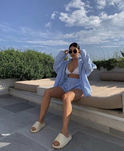 Зі шортами вдасться скласти класичний літній аутфіт. Шльопанці можна носити з топом або футболкою. До шортів краще підібрати взуття на низькому ходу чи танкетці. При цьому, варто підібрати одяг насичених відтінків.