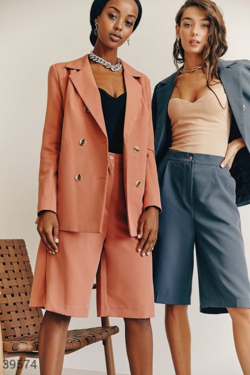 Любителькам практичності варто придивитися до костюму із шортами, який може складатися з різної кількості предметів, що мають різний фасон та забарвлення. Наприклад, це може бути такий тандем, як жакет+шорти, тріо з жакету, топа та шортів, тощо.