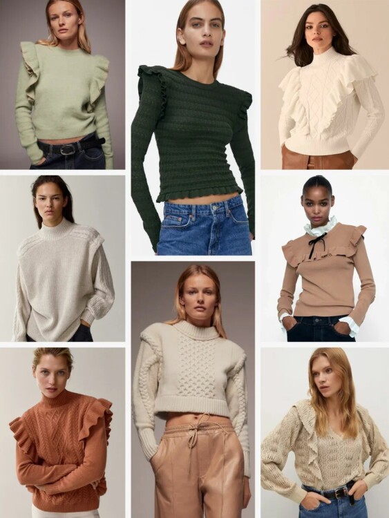 Панянки з вузькими плечами можуть радіти: светри з підплічниками знову на гребені модної хвилі. А ще – варіанти з декоративними рюшами і воланами.