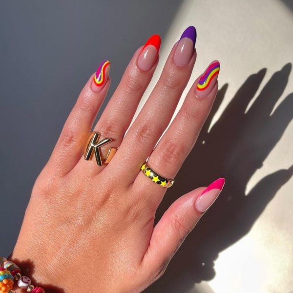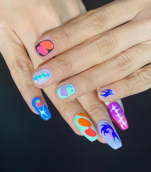 Цікава ідея, яку можна використати у поєднанні з абстрактним манікюром, – нігті різної довжини. Помаранчевий, бірюзовий, синій та фіолетовий створюють незвичайну палітру кольорів на додаток до абстрактного нейл-арту.
