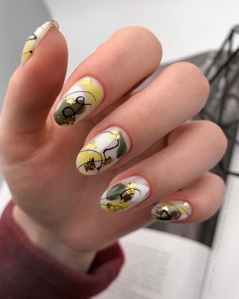 У цьому дизайні поєднується все – лінії, фігури, крапки та фольга. Насичений орнамент ще довго буде вас радувати. Найкраще для такого нейл-арту підійдуть незвичайні кольори. А золота фольга урізноманітнить манікюр.