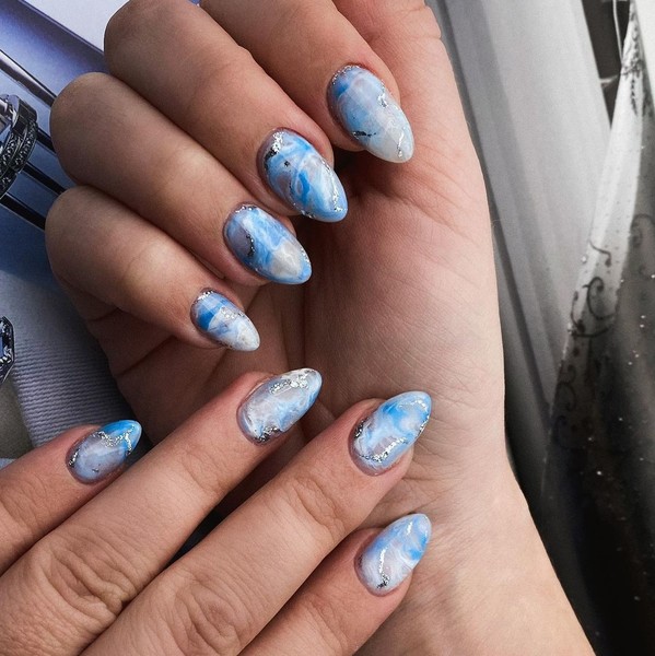 Манікюр із розводами завжди виходить індивідуальним. Мармурові лінії переплітаються на нігтиках. Гарно виглядає поєднання ніжно-блакитного та білого, які чудово доповнюють блискучі сріблясті смужки.