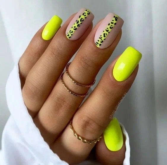 Красивий нейл-арт допоможе вам виглядати модніше. Незвичайний і яскравий манікюр надасть родзинки усьому образу. Жовтий манікюр з леопардовими візерунками однаково цікаво виглядає і на коротких, і довгих нігтях. Незвичайно виглядають сині вкраплення у леопардовому візерунку. Яскравість неонового жовтого лаку можна дещо згладити, оформивши пару нігтів ніжним матовим нюдом.