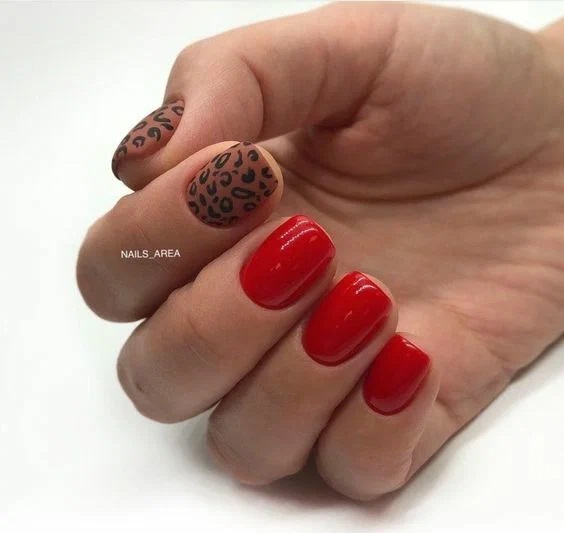 Дизайн нігтів на тему африканської савани виглядає дуже гламурно. В основу додано червоне глянсове покриття. Манікюр доповнений леопардовим принтом, який виглядає приголомшливо.