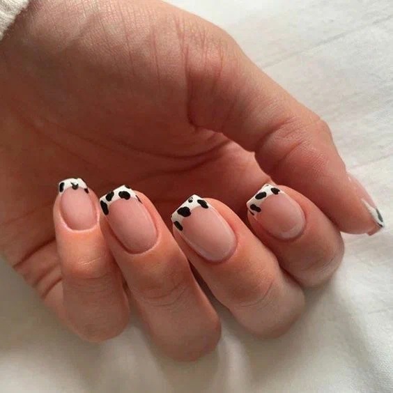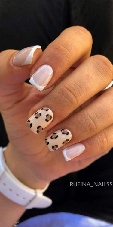 Варіацій на тему френча дуже багато. Можна оформити його в класичній гамі кольорів з рожевою нігтьовою пластиною і білою облямівкою. Тільки не забудьте поставити леопардові цятки по краю нігтя. Так манікюр заграє новими барвами. Можна також залишити пару нігтів виключно під леопардовий принт, а решту оформити у звичному стилі для французького манікюру.