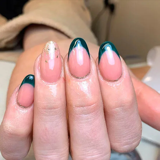 Зелений френч із золотими блискітками на овальних нігтях
