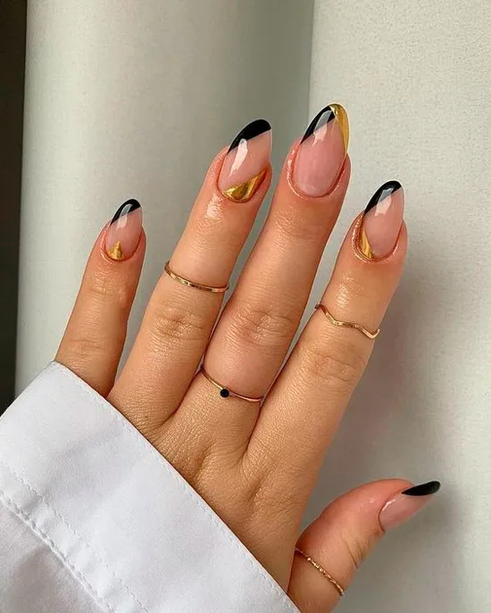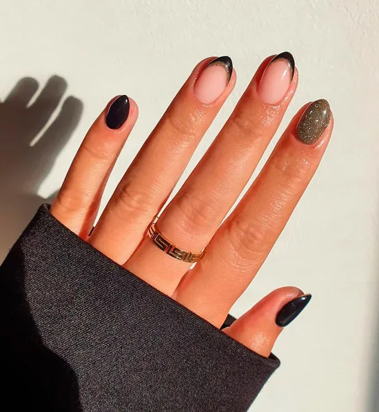 Чорний френч із блискітками на гострих коротких нігтях