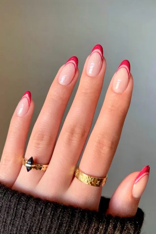 Червоний подвійний френч на довгих овальних нігтях