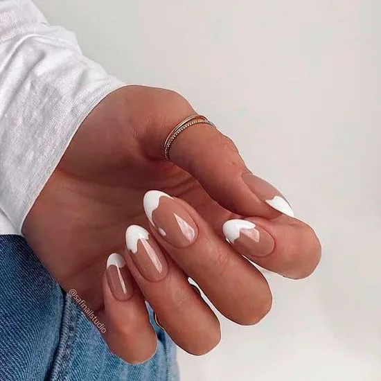 Хвилястий білий френч на овальних нігтях середньої довжини