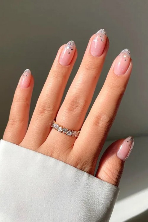 Френч із сріблястими блискітками на овальних нігтях середньої довжини