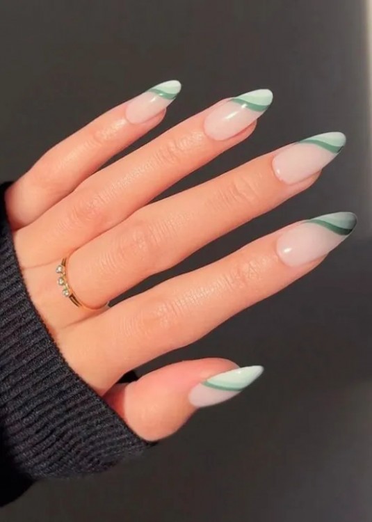 Зелений діагональний френч на довгих нігтях