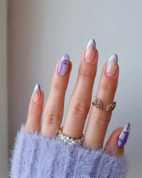 Ніжний фіолетовий френч з блискітками на гострих, довгих нігтях