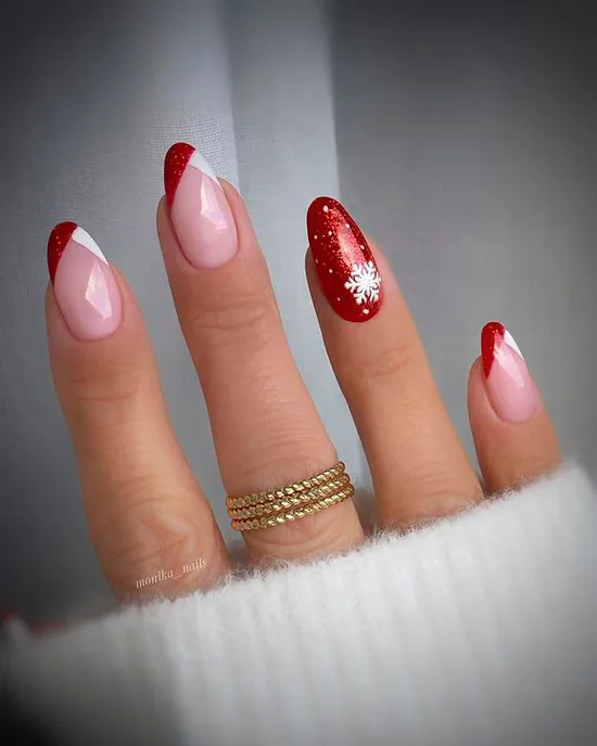 Новорічний червоно-білий френч на овальних довгих нігтях