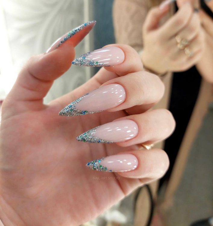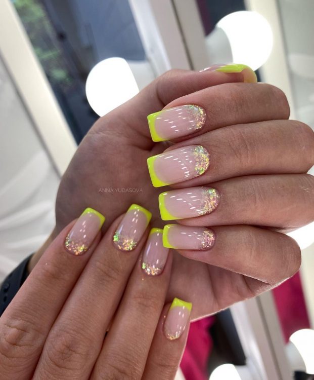 Нігтьова пластина забарвлюється в ніжно-рожевий колір, а край прикрашається блискітками або кольоровим мікро-пилом, створюючи унікальне мерехтіння. Манікюр набуває святкових ноток, сяє і переливається, піднімаючи настрій усім навколо, включаючи його власницю.