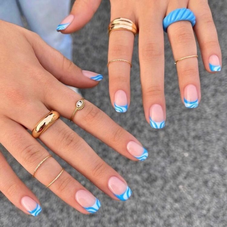Французький манікюр з використанням синіх і блакитних відтінків виглядає чудово, і гарно виглядає на нігтях будь-якої форми та довжини.