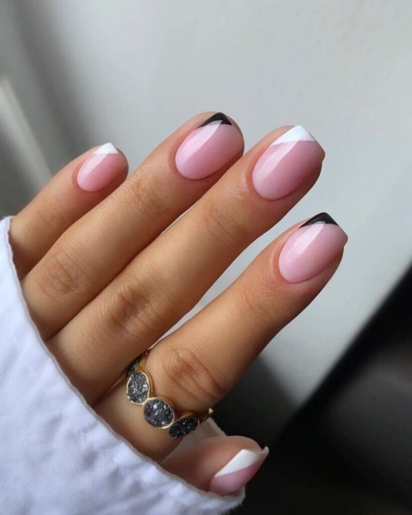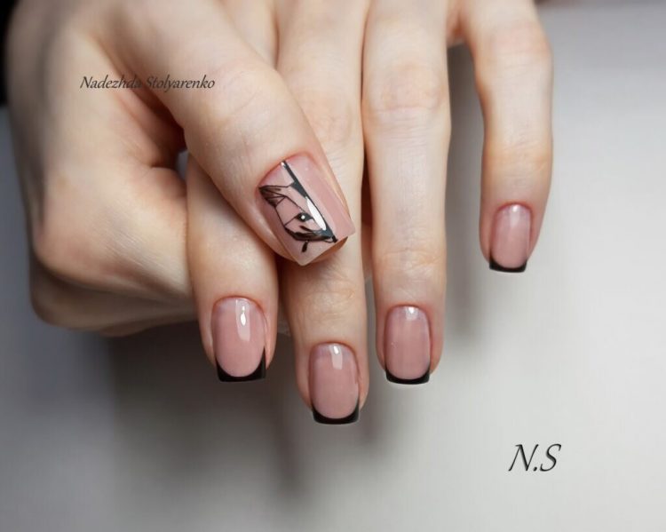 Сучасні нейл-майстри давно відійшли від класичної палітри кольорів (білий+рожевий) та виконують френч у найнесподіваніших колірних комбінаціях. Втім, любительки мінімалізму можуть придивитися до дизайну з чорним відтінком лаку та додатковими малюнками.