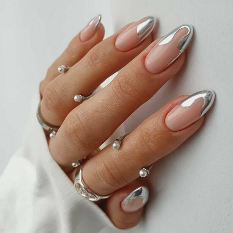 Стильно та свіжо виглядає френч з додаванням дзеркального покриття, розташованого як на кінцях нігтьової пластини, так і біля її основи (так званий зворотний, місячний френч).