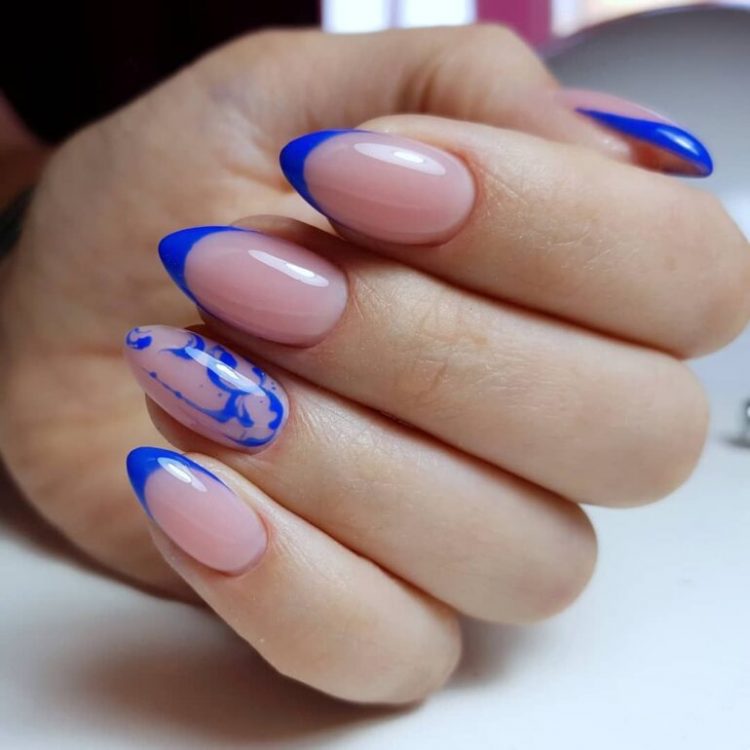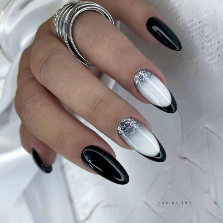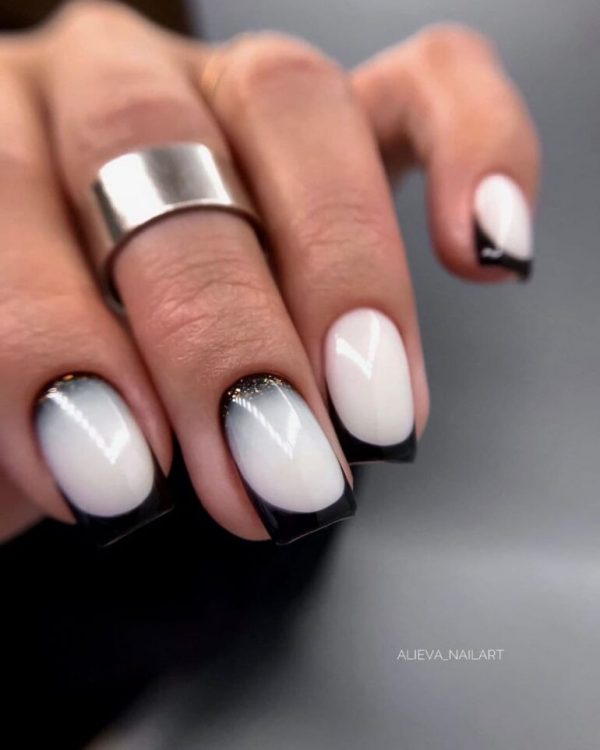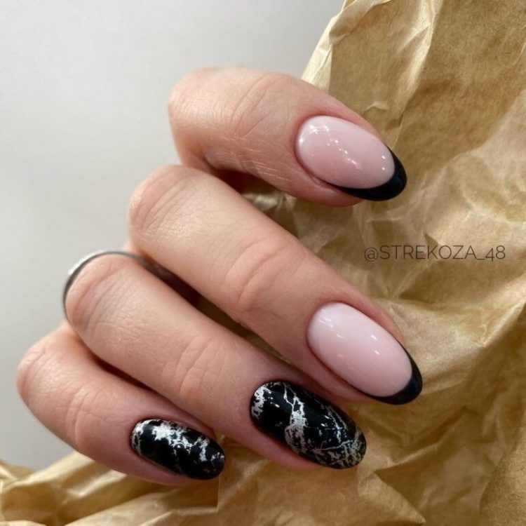 Вибираючи для френча темні відтінки, слід використовувати класичні техніки та декоративні прикраси. До найбільш топових цього року варіацій дизайнів відносять чорно-білий мармуровий манікюр на одному-двох нігтиках, а на інших – базове лакове покриття натуральних відтінків, доповнене контрастною посмішкою чорного кольору.