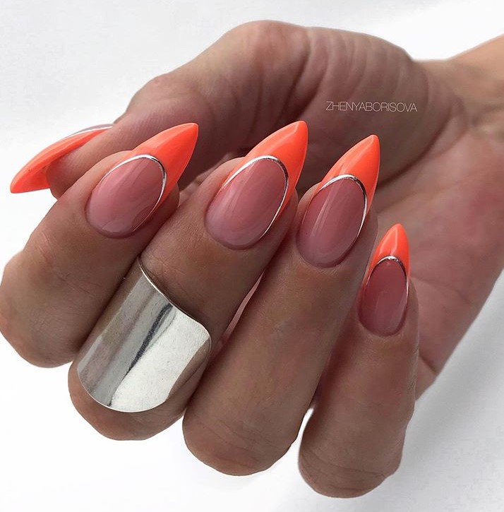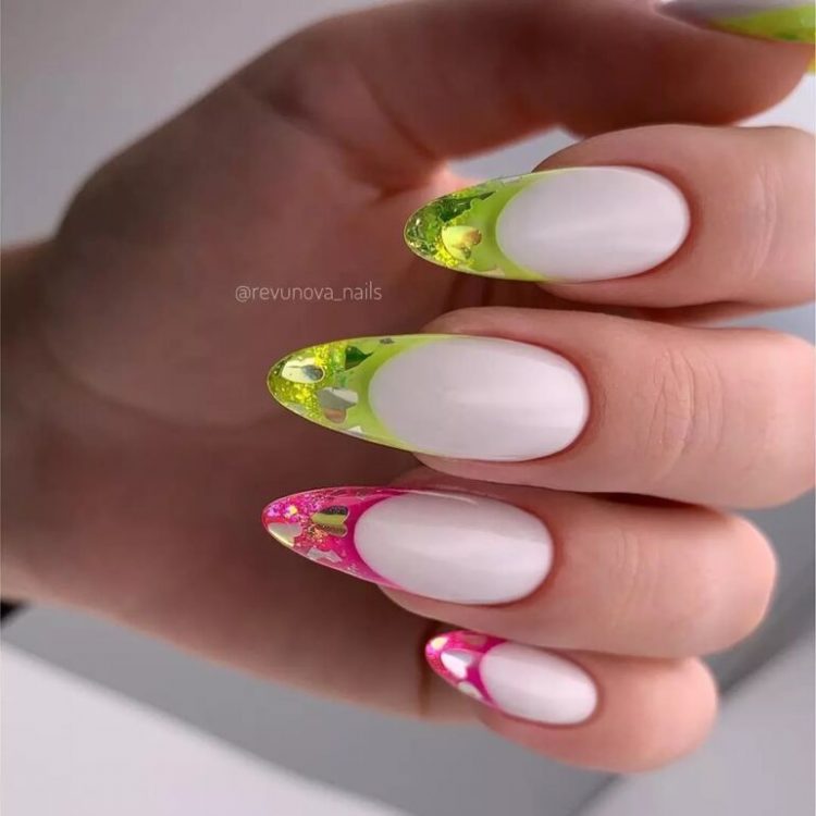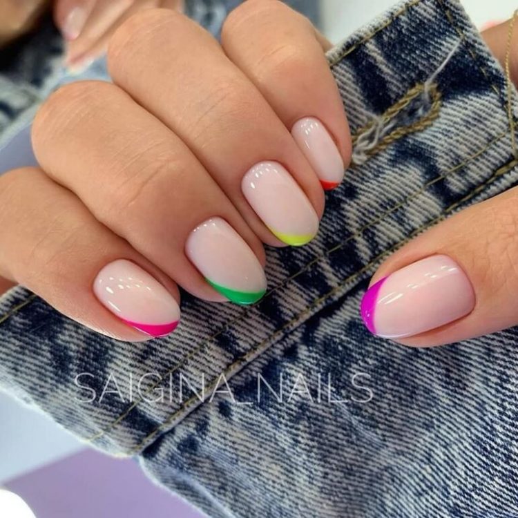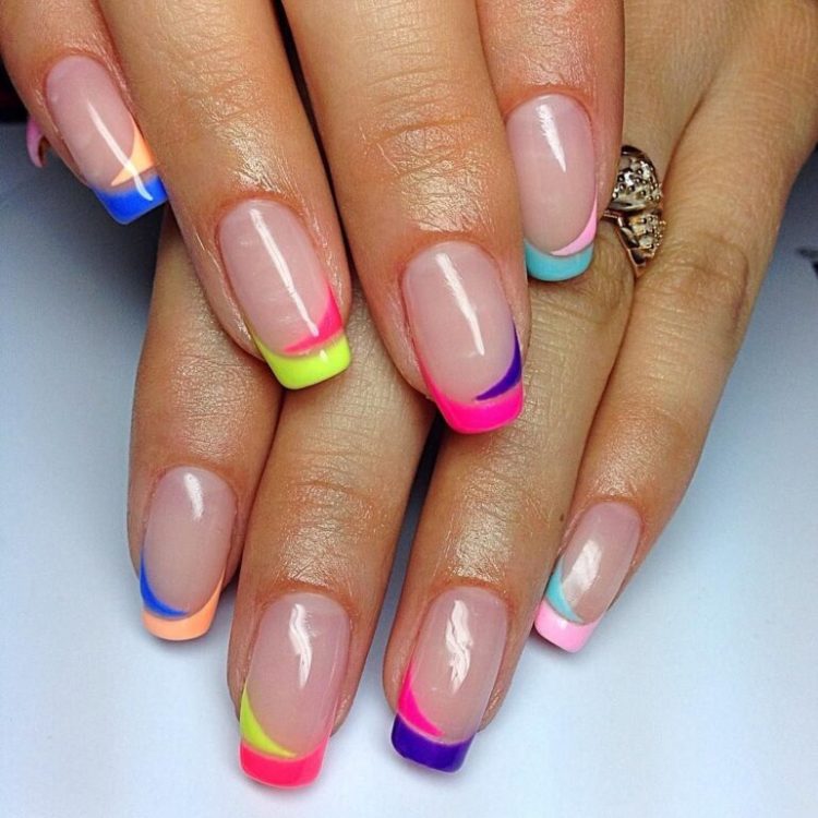 Для різнокольорового френча передбачений варіант одноманітного окантування одного відтінку або гармонійного поєднання окремих тонів для кожного нігтя. У трендах опинилися такі колірні рішення, як помаранчевий, фуксія, жовтий, смарагдовий, зелений. Популярними стали глибокий синій, небесно-блакитний та пастельно-рожевий.