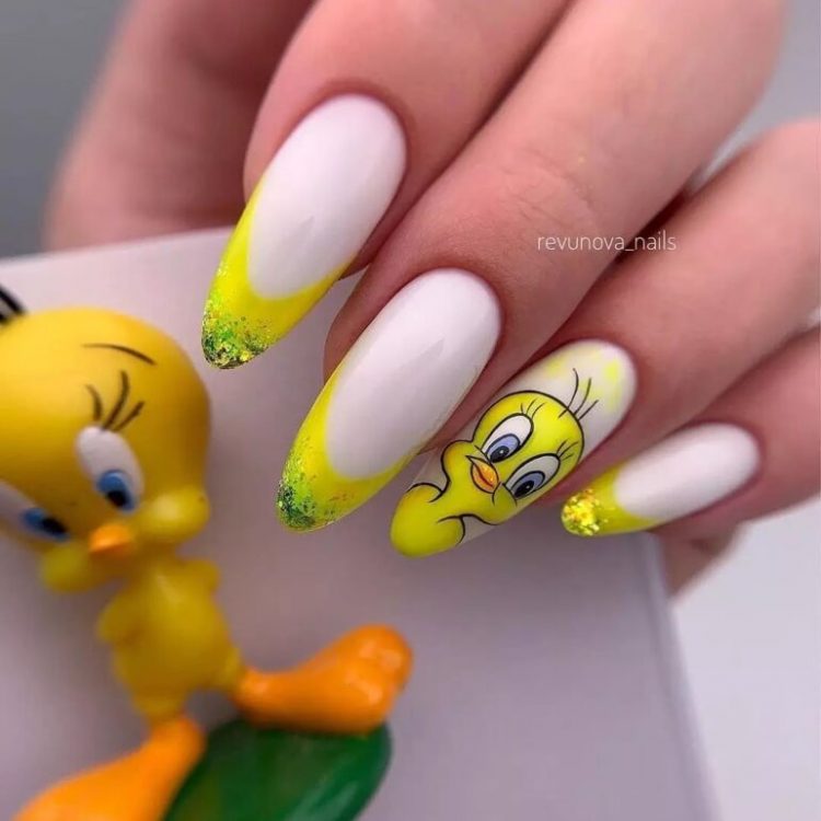 Дуже гарно виглядають у подібному виконанні гармонійний малюнок і візерунок у поєднанні з посмішкою та місяцем. Тематичні принти наносяться на один-два нігті в залежності від сезону року. Так, навесні це можуть бути зображення квітів та зелені, а влітку – море, мультяшні персонажі та фрукти.