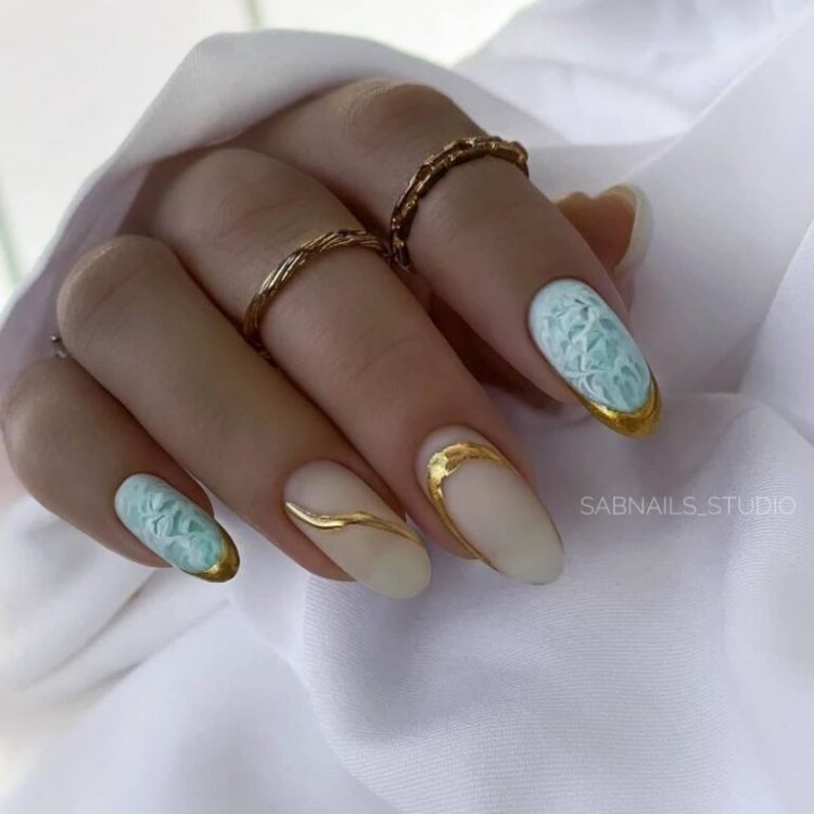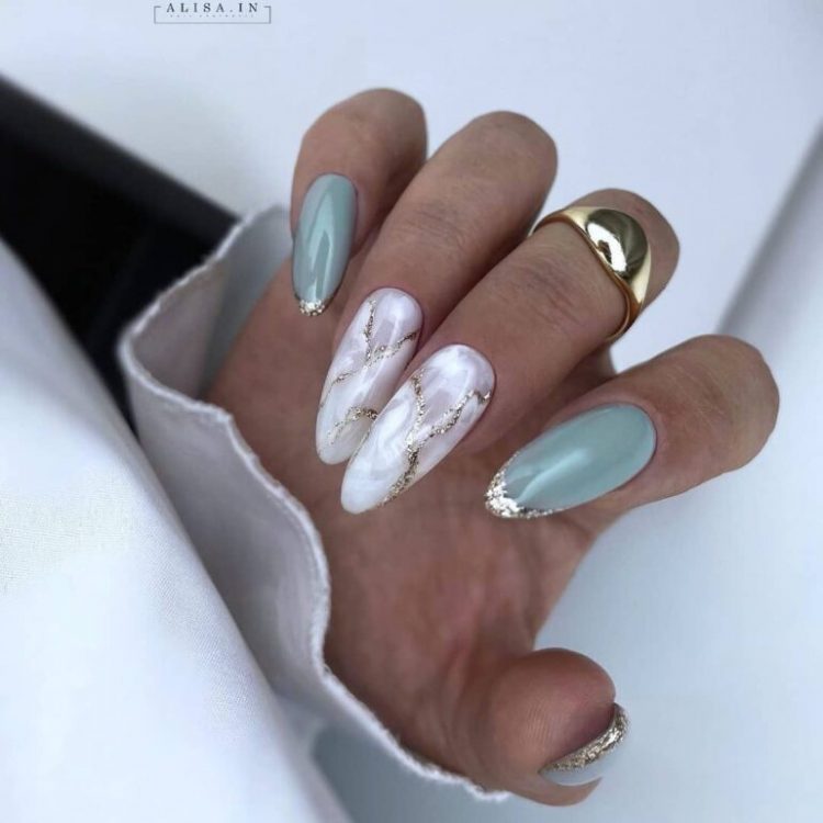 Природний та скромний зовнішній вигляд характерний для мармурової техніки, в якій на кілька нігтів наносяться прикраси. Крім того, актуальними вважаються символічні візерунки, абстрактні та геометричні мотиви. Подібний манікюр виглядатиме досить помірно.