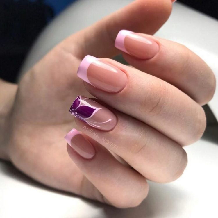 Природні мотиви добре втілюються у французькому манікюрі з витонченими узорами або великим малюнком квітки.