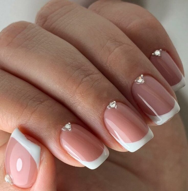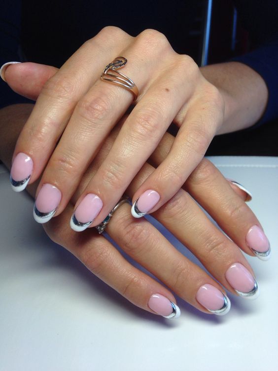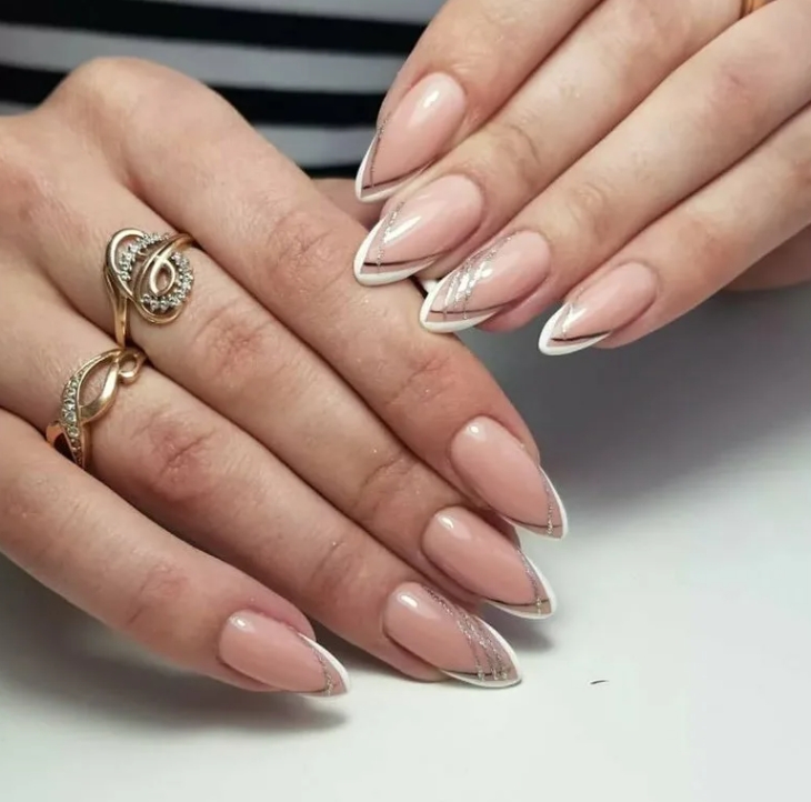 На великій довжині можна зробити ширшу посмішку але ненабагато. Окантовка може бути реалізована в різних оригінальних формах, у тому числі геометричній, скошеній та V-подібній. Нюдовий манікюр чудово виглядає в тандемі з білим кінчиком.