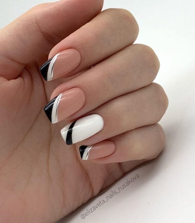 Таким же привабливим можна назвати французький дизайн з оригінальними формами окантовки – у вигляді бантика, з двох смужок чорного та сріблястого кольору, у формі численних переривчастих ліній.