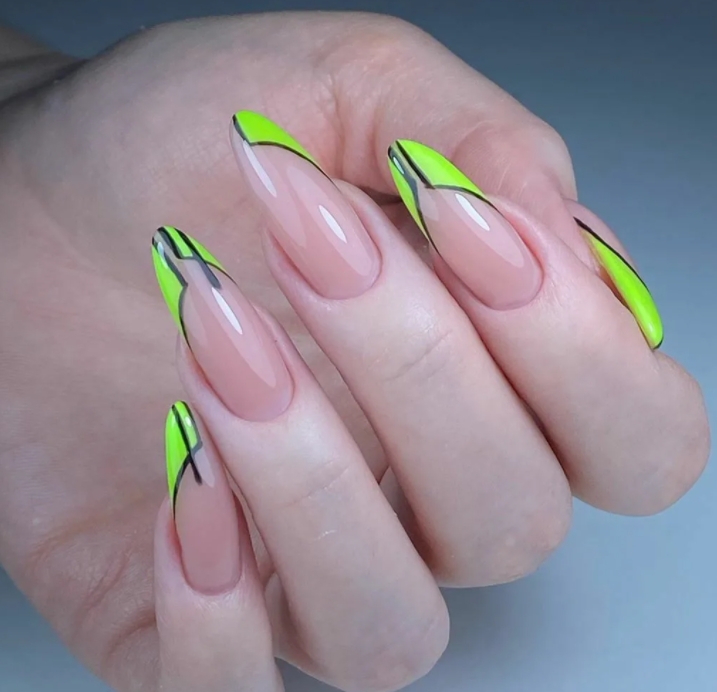 Шалено красиво виглядає на нігтиках місячний дизайн у яскравих відтінках. Такий ефект надається завдяки тонким смужкам, що прикрашають посмішку та лунку на нігтьових пластинах.