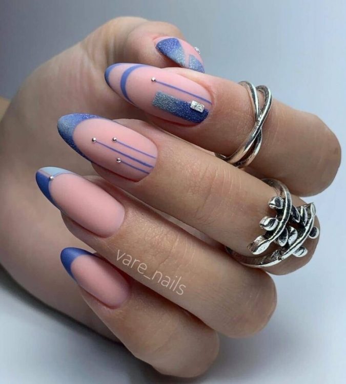 Другий дизайн поєднує два типи текстур. Тобто, матове покриття комбінується із глянсовою усмішкою, або навпаки. Не менш вишукано виглядає манікюр, у якому компонуються різні фактури та блискучі декоративні елементи.