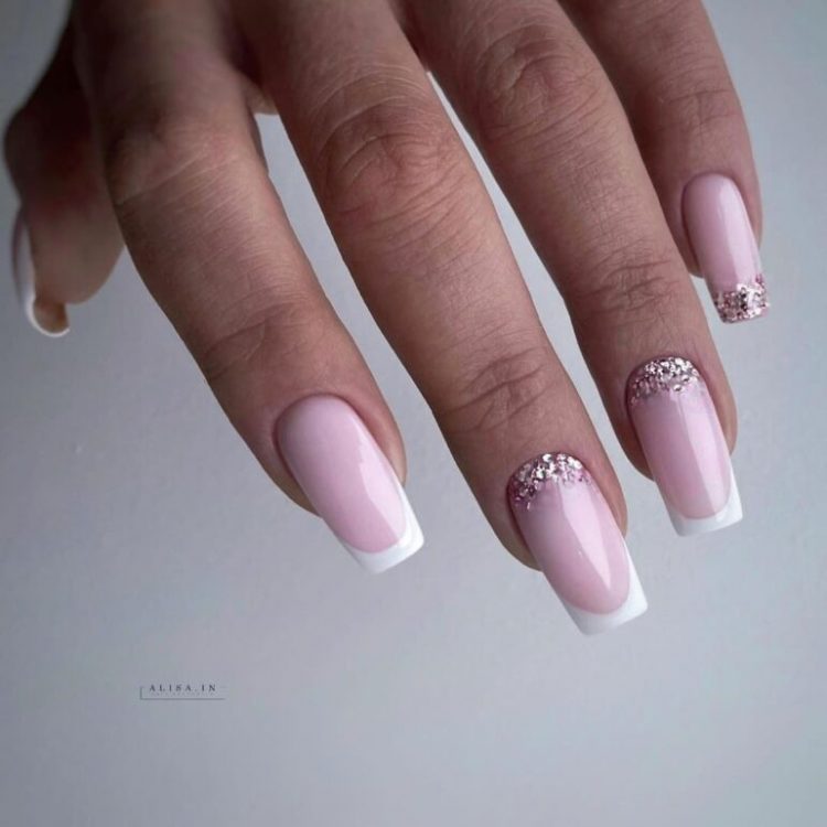 Французький манікюр в 2022 році рясніє різноманітними блискітками, що найкраще підійде для урочистих заходів. З таким дизайном можна відвідати будь-яку важливу подію.