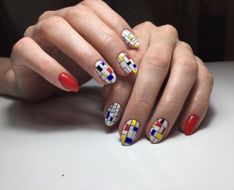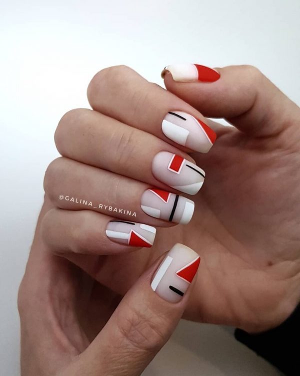 - контрастні комбінації кольорів у створенні манікюру з геометричними лініями вітаються — таким чином самі фігури виглядатимуть більш графічними та ефектними;