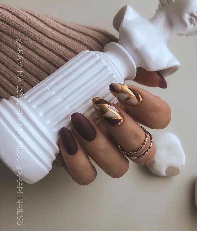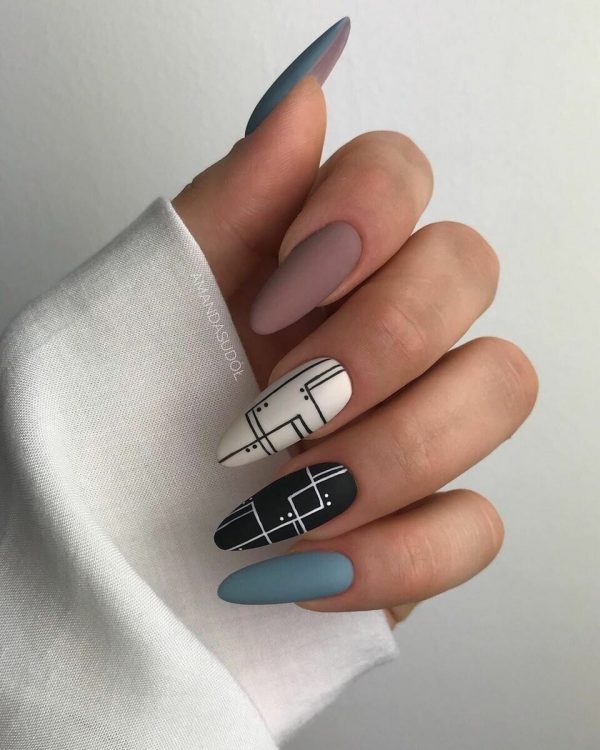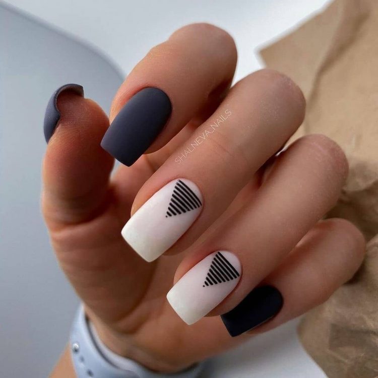 В осінньо-зимовий сезон багато модниць роблять ставку на сезонні відтінки в манікюрі, воліючи робити геометричні візерунки в сірих, білих, чорних, бежевих, бордових, коричневих, темно-синіх або смарагдових тонах. При цьому зовсім не важливо, які саме фігури ви вирішили намалювати на своїх нігтиках – геометрія виглядає дуже стильно, елегантно та ефектно.