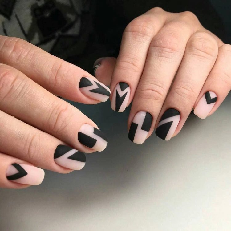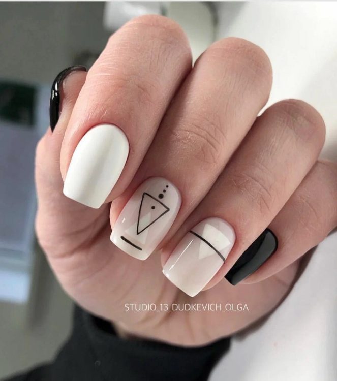 Одним із провідних трендів у нейл-арті є стильне поєднання природності та яскравих відтінків, завдяки чому з’явилося безліч варіацій нейл-арту з геометричними фігурами, пофарбованими як у натуральний беж (рожевий), так і в яскраві відтінки. Крім цього, популярна незмінна класика у вигляді чорно-білої колірної гами, а також комбінації з натурального відтінку з чорним лаком. Якщо ви віддаєте перевагу романтичним варіаціям, вибирайте дизайн нігтів у пастельній кольоровій гамі: неймовірно стильно виглядає перетин простих ліній у вибіленій пастельній гамі на тлі бежевого лаку.