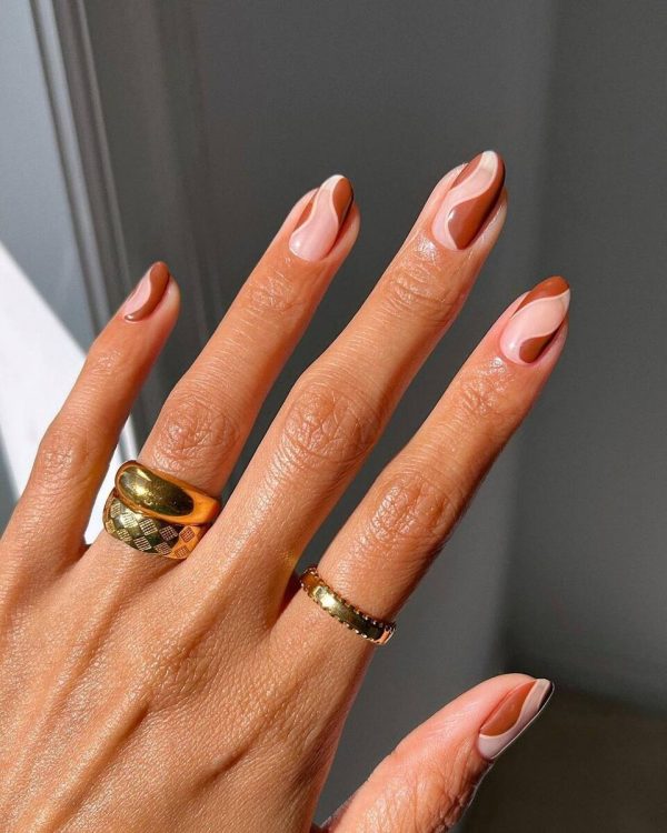 Небанальний нейл-дизайн, який виглядає стильно, – “еспресо”. За текстурою цей манікюр має нагадувати кавову пінку. Щоб повторити такий малюнок, потрібно скомбінувати відтінки різної насиченості.