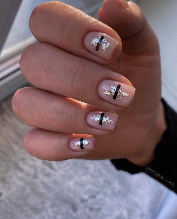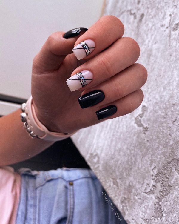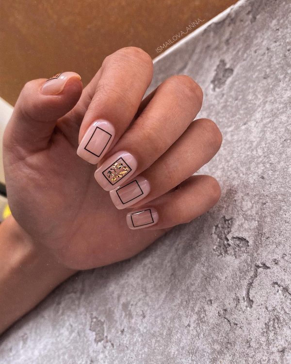 Квадратний геометричний манікюр – це безпрограшний вибір ділових жінок. Чіткість та лаконічність геометричних фігур та візерунків ніби створена для квадратних нігтів. У тренді 2022 року буде дизайн фігурки трикутників, прямокутників, смужок та зигзагів, розташованих уздовж нігтя. Стильно виглядає хаотичне переплетення ліній, виконаних за допомогою блискучої фольги або сріблястого лаку. Такий манікюр користується попитом як на урочистих заходах, так і в офісі.