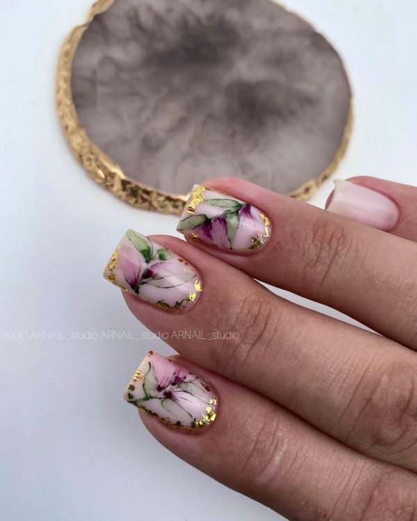 Флористика в манікюрі стане однією з найактуальніших тем дизайну поточного року. Майстри нейл-арту створюють вишукані ручні розписи квітів, гілочок, бутонів, ретельно промальовуючи найдрібніші деталі композиції. Ефектно виглядають малюнки розкішних кольорів у глянці на матовому покритті. Щоб не перевантажити манікюр, розпис робиться на одному чи двох акцентних пальцях.