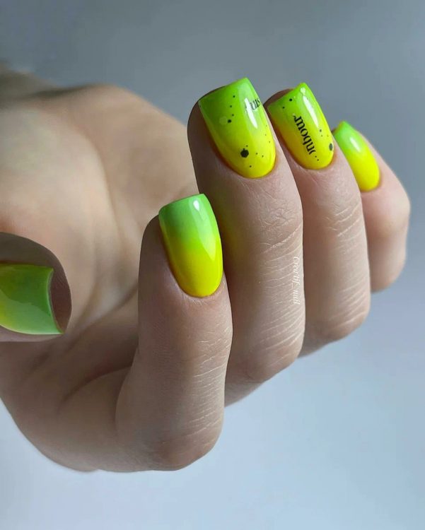 Зелений і жовтий неоновий – ці два кольори незмінно конкурують один з одним за популярністю і, при цьому, вони вдало поєднуються в градієнтному дизайні.