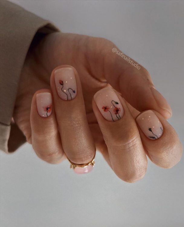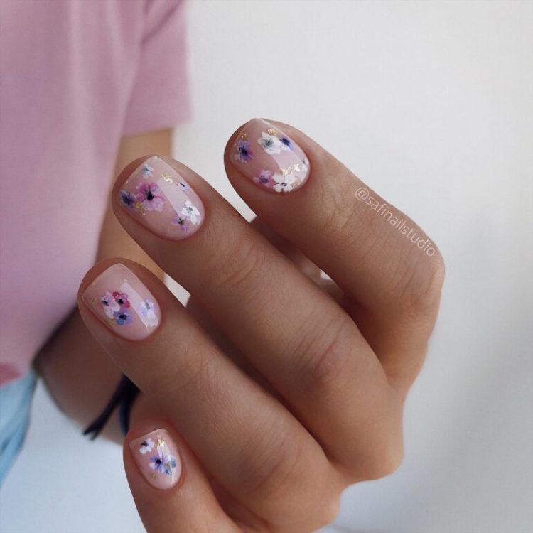 Літній манікюр 2022 на короткі нігті запам’ятається достатком квіткових мотивів. Серед найбільш топових – мініатюрні квітки, що прикрашають кілька нігтьових пластин або все одразу. У будь-якому випадку такий малюнок створить весняний настрій.