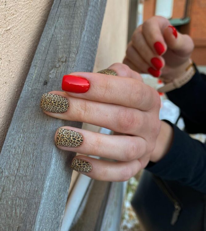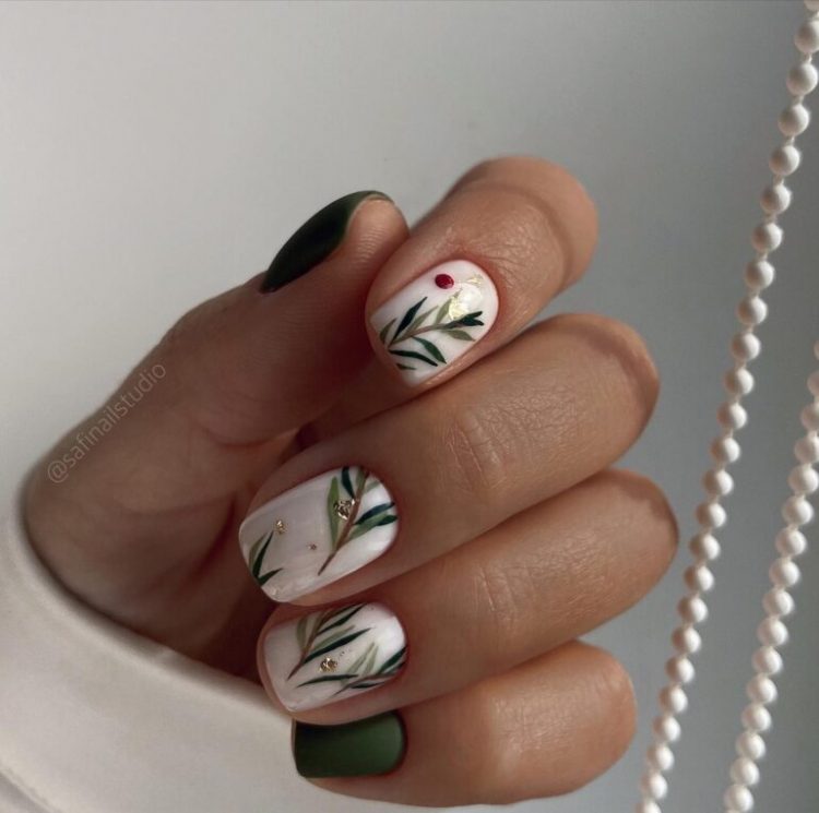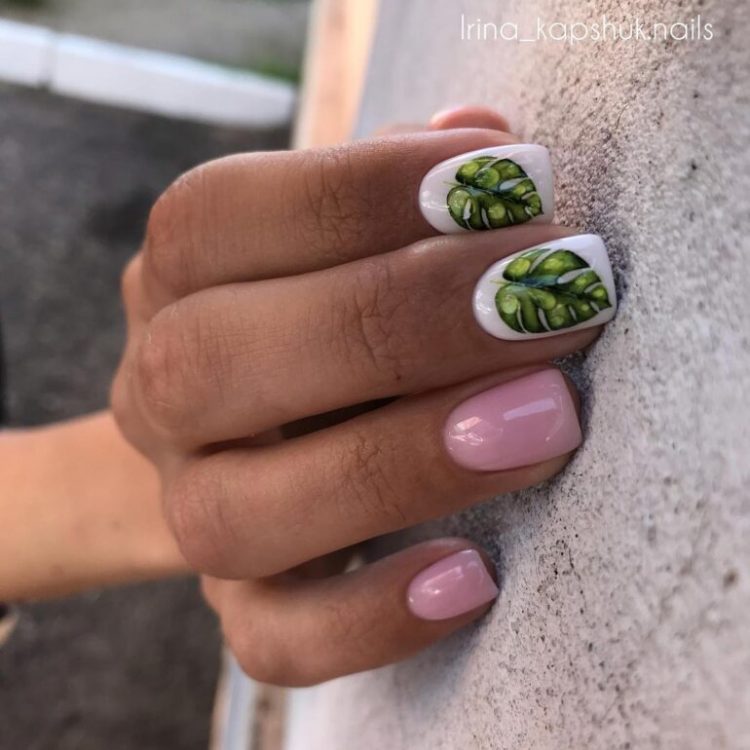 Літній манікюр 2022 на короткі квадратні нігті пропонується прикрасити різноманітним листям та гілочками. Вони можуть розташовуватися як на одному або кількох нігтьових пластинах, або бути виконаними в мінімалістичному стилі.