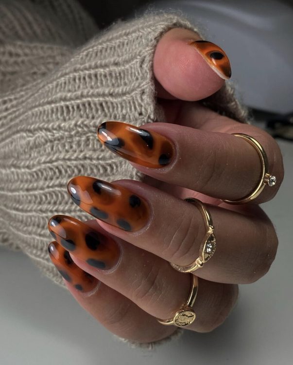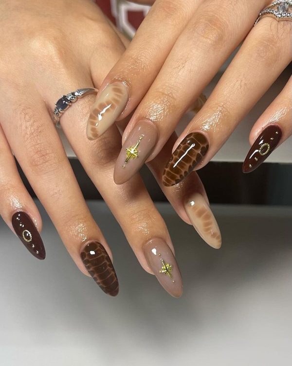 Один із найтрендовіших дизайнів сезону – манікюр в естетиці mob wife. Щоб повторити його, потрібно прикрасити нігті анімалістичним принтом. Наприклад, зробити черепаховий нейл-арт або зобразити імітацію лусок змії.