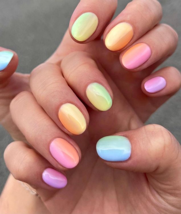 Ще одне нетипове рішення – пофарбувати всі нігті у різні кольори. Відтінки можуть бути схожими і ледь відрізнятися один від одного. А найсміливішим дівчатам варто придивитися до дизайнів, що поєднують в собі кілька яскравих тонів.