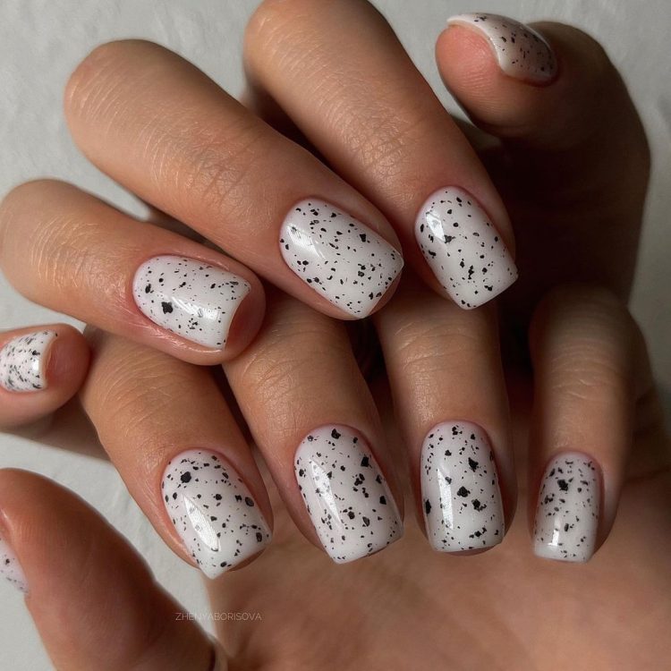Тренд, який знову повернувся до моди. Особливість манікюру полягає у невеликих цятках на білій поверхні нігтів.